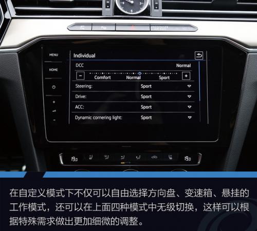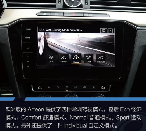欧洲版的Arteon提供了四种常规驾驶模式,包括Eco经济模式、Comfort舒适模式、Normal普通模式、Sport运动模式。另外还提供了一种Individual自定义模式,在自定义模式下不仅可以自由选择方向盘、变速箱、悬挂的工作模式,还可以在上面四种模式中无级切换,这样可以根据特殊需求做出更加细微的调整。