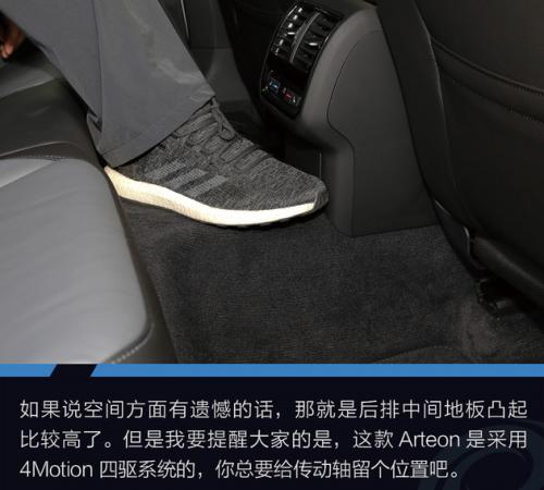 如果说空间方面有遗憾的话,那就是后排中间地板凸起比较高了,基本上坐在后排中间位置是得不到什么舒适感的。但是我要提醒大家的是,这款Arteon是采用4Motion四驱系统的,你总要给传动轴留个位置吧。