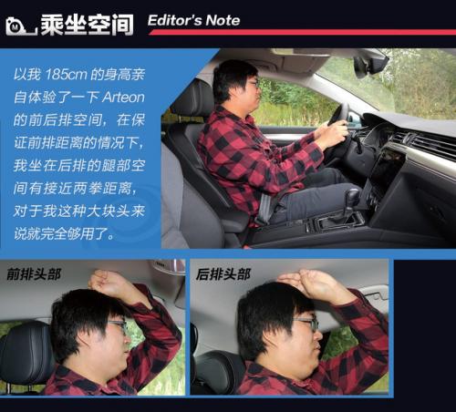 而且流线造型并没有影响到Arteon的车内乘坐空间,以我185cm的身高亲自体验了一下Arteon的前后排空间,在保证前排距离的情况下,我坐在后排的腿部空间有接近两拳距离,对于我这种大块头来说就完全能够松松快快的坐在后排了。