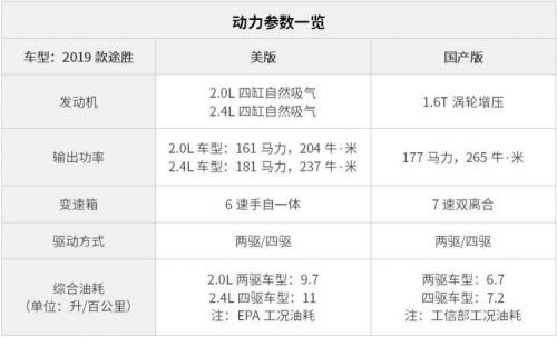 在动力方面,是中美两款途胜的配置差别最大的部分,美版提供两种动力配置,一个是2.0L四缸自吸发动机(161马力,204牛*米),另一个则是2.4L四缸自吸发动机(181马力,237牛*米),均匹配一台6速自动变速箱。而国产版则依旧是全系标配一台1.6T涡轮增压发动机(177马力,265牛*米)匹配一台7速双离合变速箱。中美版均有两驱和四驱车型供选择(国产版途胜仅旗舰车型为四驱驱动方式)。2019款美版途胜这次放弃了原有的1.6T 7速双离合的动力配置。外媒在试驾后就表示,2.4L 6速自动变速箱的动力总成更为成熟稳定,相比老款车型提升进步很明显(美版老款的1.6T发动机车型在动力方面评价并不是很高)。