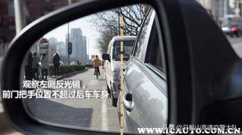 还有观察左侧后视镜,尽可能使左边车门门把手的位置不超过后车的车身,不过如果后车停车不规范,那么观察也是白费,所以在停好车后,观察左后方交通情况,确认安全后,下车环绕车身观察一下距离。