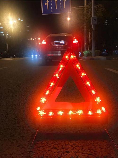 如何避免二次事故?对后方车辆的提醒是关键。法规要求,所有车辆必须配备三角警告牌,并在车辆发生故障或交通事故时,将其置于车辆后方安全距离,以提醒后车避让,就是为了能够在发生事故后尽可能提醒后方车辆注意。然而,传统的三角警告牌,只能依靠醒目颜色提醒后方车辆,可视范围小、有效距离短,在夜间、雨雪等恶劣天气条件下效果还会进一步降低。与此同时,由于很多驾驶员在车辆发生事故时摆放三角警告牌距离车辆较近,更减弱了后车提醒效果,从而增加了二次事故的风险。