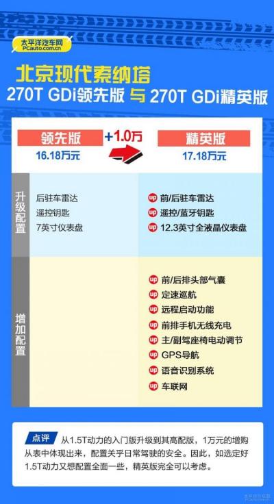 270T GDi精英版比入门版增加1万元,配置上采用双12.3英寸的大屏联同,并增加了前/后排头部气囊、定速巡航功能、主副驾座椅电动调节、车载智能互联系统等,对预算充裕的消费者,这部分的提升还是蛮有吸引力的。