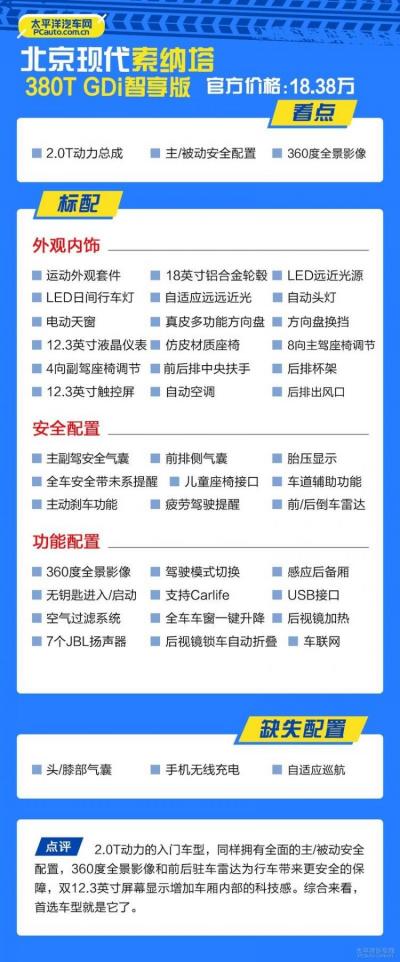如果你觉得B级车就应该享受更强悍的动力,那接下来这款380T GDi智享版就再适合不过了。结合价位考虑,这样的组合在B级车市场可谓竞争力满满。作为2.0T动力的入门车型,配置层面不会跑偏太多,因此也是本次最为推荐的车型。