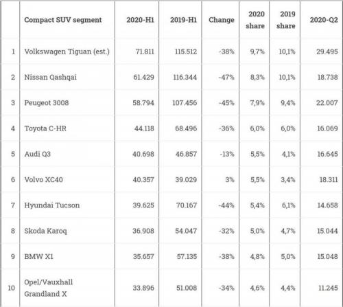 2020年H1(上半年)欧洲紧凑型SUV销量表TOP 10