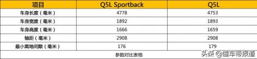 从表中可以看出,两款车型的轴距相同,不过存在尺寸方面的区别,离地间隙Q5L Sportback也低了3毫米,从设计上更加注重运动性和操控性。