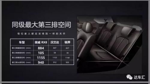 虽然荣威RX8的轴距只有2850mm,在同尺寸竞品车型中并不占优势。但荣威RX8采用了阶梯式座舱设计,让第二排的可调行程达到夸张的230mm,而同级竞品如汉兰达、锐界只有150mm左右。