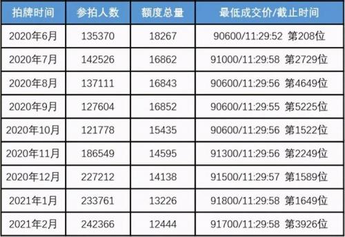 2021年“新春首拍”的拍卖结果出炉。2月合计拍卖总数12444辆,参加拍卖人数242366人,比上月增加8605人,中标率5.13%,最低成交价91700元。此次中标率依旧呈下跌趋势,从去年12月的6.22%、今年1月的5.66%,持续跌至今年2月的5.13%。