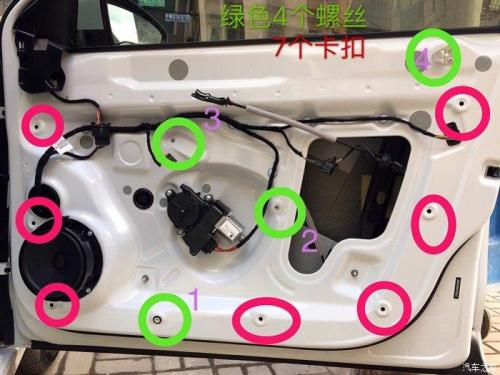 螺丝1和2位置很简单,很容易找到,螺丝3是在扶手那个位置,需要把扶手那个位置拆掉,就能看到第4个螺丝位置,是在门饰条那,拆下来就能看到一共11个固定的地方,全部拆下以后门板就下来。