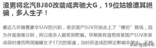 一台奔驰大G,普普通售价都在150万左右,一台北汽BJ80,充其量也不过20几万的价格。于是很多买了北汽的“渣男”,悄悄把自己的爱车开到改装车厂,换个奔驰的LOGO,再改一个和大G一样的中网,这车的价格一下子好像就翻了几番。曾经还有个消息,说一个男人用一台改装之后的BJ80,成功骗了19个女生,可见其仿真程度之高。