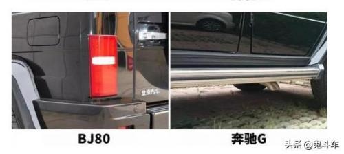 打眼一看的两个车头,虽然都是方正的,但是BJ80明显更小一些,并且你知道吗,BJ80在这个板块仿制的是路虎经典卫士。只是将黄色转向灯和白色车灯调换了位置,所以如果想要爆改的话,那么这一个部分,就要全部换掉。接下来就是BJ80的常规排气口位置是在车的后面,但是奔驰G确实在侧面,这个如果不改的话,一眼就能看出来。当然,还有一个非常明显的地方,BJ80的开启尾门把手在左边但是大G却在右边。