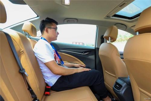 172cm的体验者调整好座椅后,头部空间有一拳三指的空间,后排的头部空间有一拳二指,腿部空间足足接近两拳。