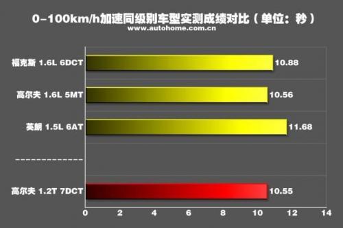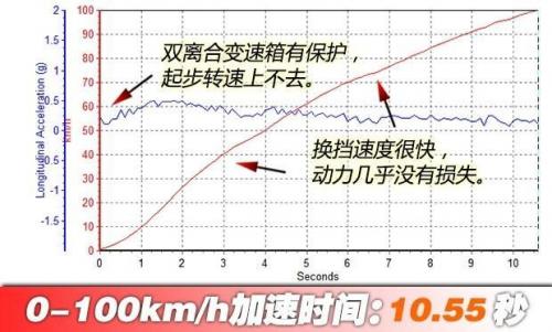 由于DSG变速箱在起步阶段的自我保护,发动机转速只能提升至1400rpm,没有挠胎没有扭矩转向,除了能感受到的一点推背感之外,一切都很平淡。变速箱换挡速度很快,加速过程中动力损失很小,经过两次升挡之后破百,用时10.55秒,略快于官方给出的10.6秒。这个成绩也和同级别中搭载1.5L、1.6L发动机的车型差不多。至于大家最关心的和东风标致308S 1.2T车型的加速对比如何,在这先卖个关子,近期我们就会带来两车的性能测试。