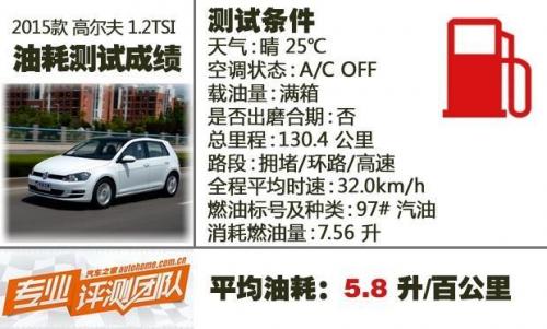 油耗测试中高尔夫1.2T行驶了130.4公里,消耗燃油7.56升,平均油耗5.8升/百公里。需要注意的是当天气温25摄氏度,没有开启空调,路况也比较畅通,平均时速达到了32km/h。要是在拥堵路况下油耗肯定会高一些。