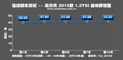 相对于加速,高尔夫1.2T的刹车成绩就不能令人满意了。从曲线图上看刹车力度不强,基本都没到-1g而且还不够平稳,波动也比较大。唯一令人欣慰的就是在热衰减控制方面还不错,连续十次刹车的成绩都很稳定。