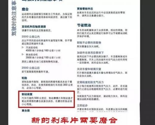 另外,即使是新车,刹车系统也是需要磨合的。在汽车的使用说明书中明确规定了这一点,一般要求刹车系统磨合里程为500公里,在这个里程之内,请谨慎驾驶。主要原因也是因为刹车盘和刹车片接触面积达不到规定的标准。另外,新的盘和片表面上还有一层氧化膜,会使二者的摩擦系数降低,制动力也会下降。