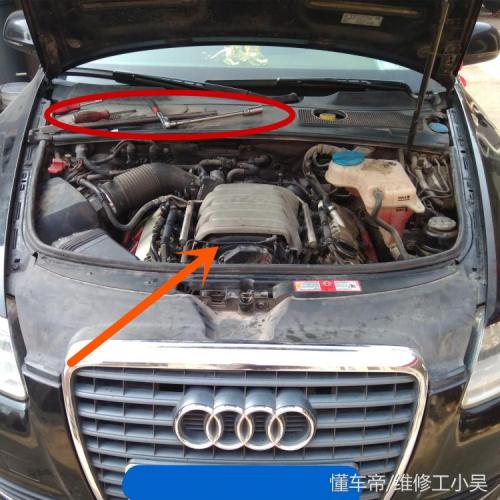 下图所示的就是这辆漏油的奥迪,由于它是气门室盖漏油,所以它基本不需要师傅耗费很多的精力来检查,很容易就找到问题所在。箭头所示,这是V6发动机,2.4排量。红色区域所示,这是拆卸气门室盖的工具。