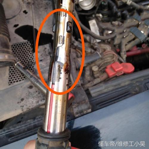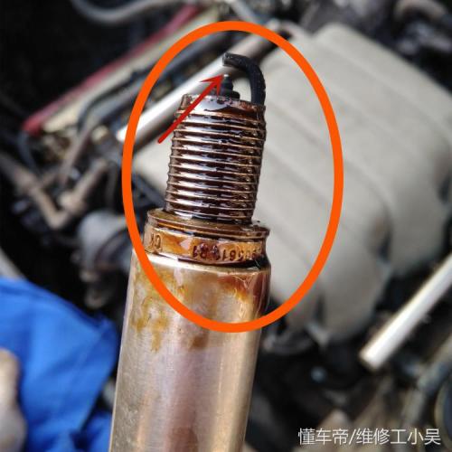 下图所示,汽修师傅把火花塞也给拆了下来。下图橙色区域所示,火花塞上面已经被机油覆盖。同时,我们也可以看出红色箭头所示的火花塞电极位置,这里没有问题,不影响点火!