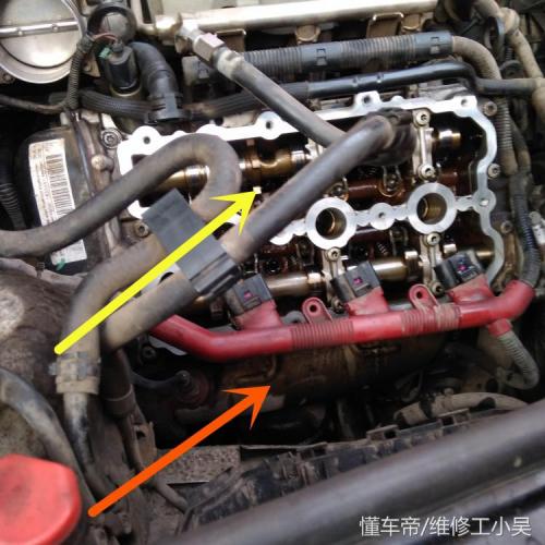 下图所示,这是汽修师傅拆下气门室盖之后的情况。黄色箭头所示,我们可以看出它的进排气凸轮轴上面还是比较干净的,可见车主对发动机的保养还是比较好的!橙色箭头所示,气门室盖渗出的机油已经流到排气歧管上了!