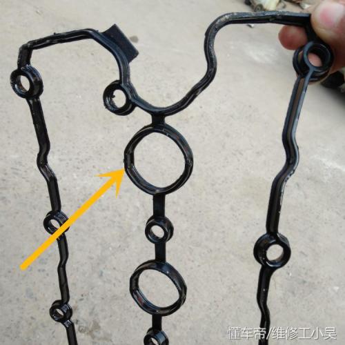 下图所示,这是旧的气门室盖垫,我们可以看出它的橡胶已经老化变硬,不易变形,密封性不好。和上图橙色区域所示的新气门室盖垫比较,新的可以随意折成一团,但是老化的垫子只要折叠一下就会断!