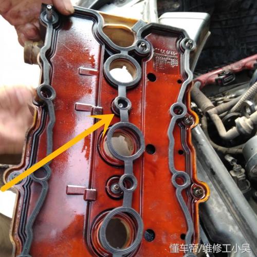 汽修师傅很快就把气门室盖给拆下来了,下图红色区域所示,汽修师傅正在拆卸旧的气门室盖垫。橙色区域所示的是新的气门室盖垫,橡胶材质!