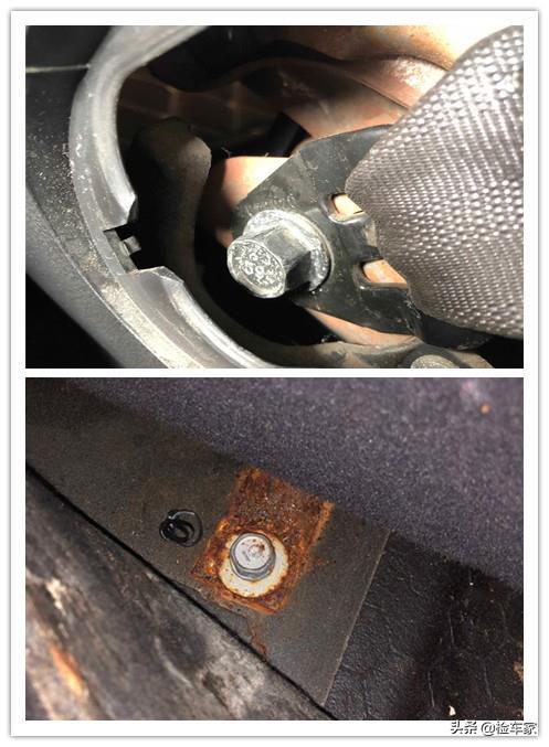 按照之前约定好的暗号,客户心领神会把卖家按倒(口误),客户把卖家拉到里屋去聊天,老王赶紧拆开安全带周围饰板,不拆不知道,一拆吓一跳。座椅骨架严重锈蚀,这个锈迹可不是普通的自然锈迹,并且安全带的固定螺丝还有拆卸的痕迹,基本上可以判断这车内饰进水了,不过为了找到更多证据,其它地方一定还有痕迹的,咱们再看看!