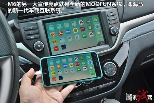 M6的另一大宣传亮点就是全新的MOOFUN系统,即海马的新一代车载互联系统。除了基本的影音功能外,通过与手机互联,可以实现双屏操作、应用拓展等,当然,看到繁杂的连接线,好心情立刻没有了。更实际的其实是APP操作,可以实现远程定位车辆、开启灯光、解锁车门等功能;同时支持预约保养、本地信息等内容。可以说,MOOFUN的功能全面且强大,海马也希望藉此来吸引那些“泛90”人群。我个人的观点相对保守,现在火爆的各类车载互联系统,确对消费者有所帮助,但实际使用效果有限,在不增添过多购车预算的情况下,可以考虑。