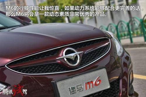 总的来说,M6的行驶性能让我惊喜,如果动力系统能够配合更完善的话,那么M6将会是一款动态素质非常优秀的产品。同车的媒体笑话我,对一台10万元内的大紧凑级车型,要求不要太苛刻。其实我并不是愤青,希望花夏利的钱买宾利,但是对于10万元的家用车,可靠的产品、成熟的调教是最实惠的东西。