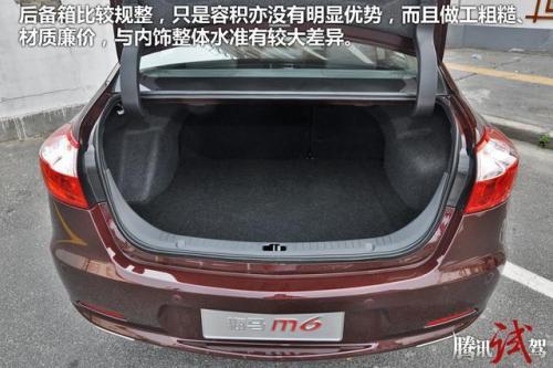 在空间体验上,M6还是表现出不错的水平,各类杯架储物格丰富,满足日常所需绰绰有余。比较鸡肋的算是中央扶手,位置偏后、容积过小,实用价值不高。另外,后备箱比较规整,只是容积亦没有明显优势,而且做工粗糙、材质廉价,与内饰整体水准有较大差异。