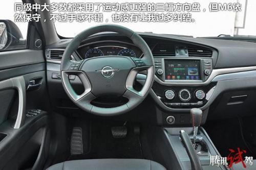 同级中大多数都采用了运动感更强的三幅方向盘,但M6依然保守,不过手感不错,也没有让我过多纠结。仪表台的设计很复古,虽然加入了彩屏设计,但精致度不高。