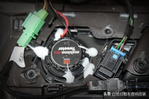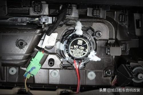 前声场安装摩雷优特声602套装喇叭,根据车主的听音喜好,选择这款以色列喇叭,原位安装在前车门板上,加上一个丽音圈让声音效果更好