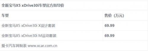 2019年9月25日,全新宝马X5 xDrive30i车型正式上市发售,新车共推出2款车型,售价为69.99万元。作为家族中的第四代车型,采用新家族式设计语言的全新宝马X5基于CLAR平台打造而来,本次上市的xDrive30i车型搭载2.0T发动机。
