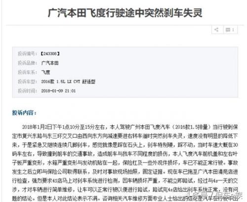 可以看到,这位车主的投诉完全印证了《环球汽车网》对飞度制动系统测试的调查。同样,另一位用户也投诉称:“在2016年5月24日,车子在下坡行驶的过程中,踩脚刹怎么踩也踩不下去。”由此可见,本田飞度制动出现失灵情况,并不是个别案例。相反,在每一次失灵出现,都可能造成生命财产的安全,而对于制动系统失灵,不管是车主还是媒体,绝对零容忍,因为事关生命安全!