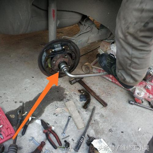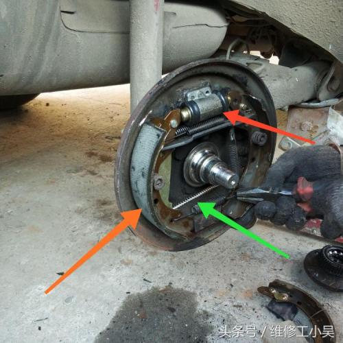 汽修师傅确定了问题位置后,开始检查刹车片,最终决定更换刹车片!下图橙色箭头所示,汽修师傅已经把新的刹车片给换上了。这辆老捷达的后刹车是鼓式的,刹车片的更换难度要大一点!红色箭头所示,汽修师傅已经更换了漏油的刹车分泵。