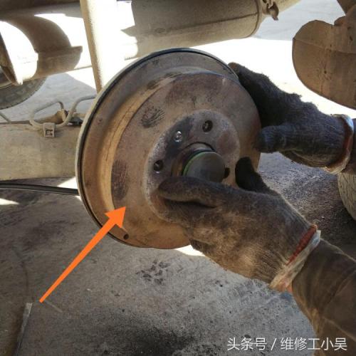 下图所示,汽修师傅正在安装刹车鼓!刹车鼓只是用两个很小的螺丝固定在轴头上。