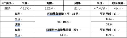 而星瑞凭借更强的2.0TD发动机和高强度车身双重加持,则要比速腾从容很多,给予驾乘人员更多安全感和信心。随着负载越重,星瑞加速时转速并不需高攀升就能带动车辆前行,并加赛成功挑战了1360斤、1380斤以及1400斤负载,从车辆驾驶状态上可看出仍有继续增加负重的潜力。但最终考虑到冰层厚度和安全等客观情况,星瑞在挑战完1400斤后选择停止继续突破极限。
