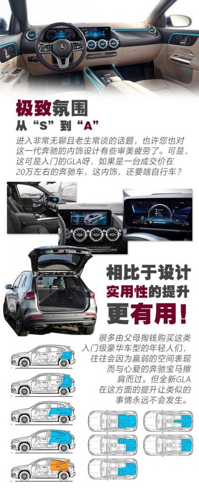 内饰设计分为设计和空间两个维度、设计方面这一代奔驰的内饰氛围无须多言。即使推出多年已经出现了一些审美疲劳、可要知道这可能是一台未来终端售价在20万上下的SUV,能配上和S级氛围相差不大的内饰还是奔驰Logo加持,结果可想而知。但受限于过于随意的外形,现款GLA的内饰空间也可以用感人来形容。全新车型优化后,功能性和客观物理上的空间都有所保障,我们也期待未来试驾体验后的真实反馈。