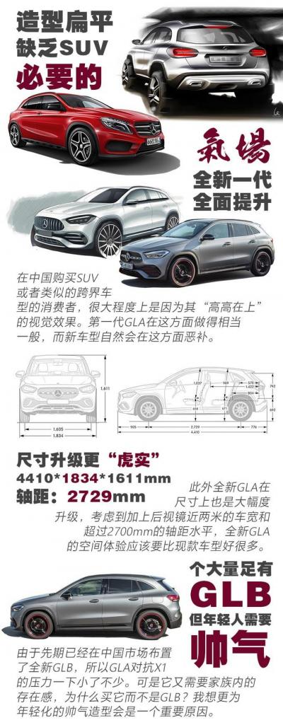 为什么说初代的GLA产品力并没有明显的优势呢?首先它的上马过于催促、那个年代的奔驰在是否要将准入门槛打得这么低还心存犹豫、以致于GLA 2013年发布时、BMW X1/AUDI Q3等产品已经将市场空间蚕食的差不多了。斯图加特老铁看着同乡们的行为,发现推出低价车在中国的表现是真香!所以一台更像拉高的A级或者像GLK被拍扁的GLA就这么上市了。虽然外观和空间不太给力,但不温不火的它似乎销量也还过得去。奔驰又在新一代车型上市前发布了GLB,那全新GLA的地位就格外的尴尬。再不强大就要被自家人革命了!