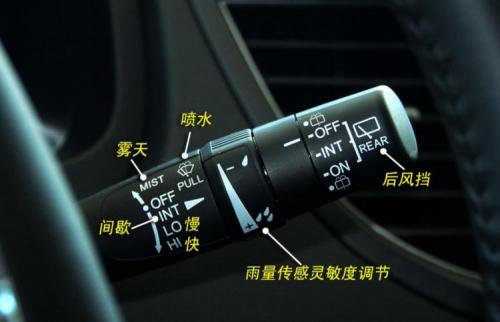 右侧还有雨刮器调节装置,如图所示为CR-V的雨刮器调节杆,调节时可以根据调节杆上的图标上下推调节杆,并根据雨量很大,在挡风玻璃上洒水时需要向驾驶员拉动操纵杆。带有后雨刮器的车型也可以在这里调节,并且徽标完全相同。