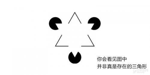 为什么会这样呢?我们的知觉系统倾向于在没有延续的地方设下出一种延续,清晰的明暗交界线会为我们预设两个面,我们的大脑会自动脑补两侧的亮部和暗部,即便它们可能并不是平面。例如经典的卡尼察的三角形,并没有实际画出中间的三角形,但你的大脑会识别出中间是一个三角形。