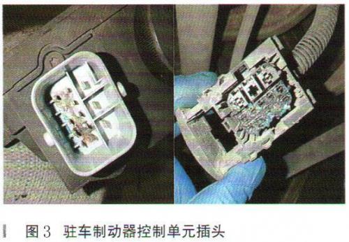 当拔下驻车制动器控制单元插头时发现控制单元插头处严重进水,并且控制单元插针严重腐蚀,如图3所示。