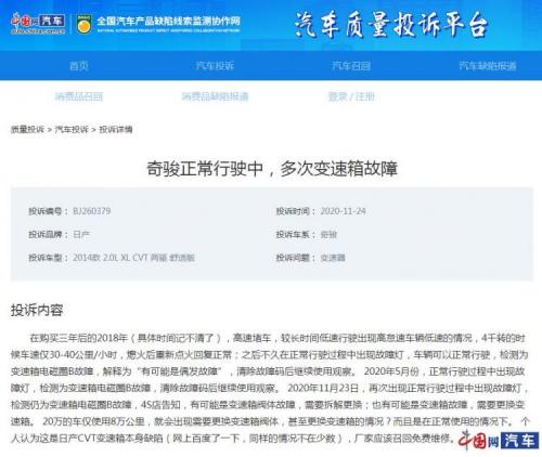 车主向记者表示,自己花费20万的车,才行驶了8万公里,就出现需要更换变速箱阀体,甚至更换变速箱的情况,对此,自己无法接受。且车主告诉记者,通过自己在网上查询,该车的类似问题并不在少数:“个人认为这是日产CVT变速箱本身缺陷,厂家应该召回免费维修。”
