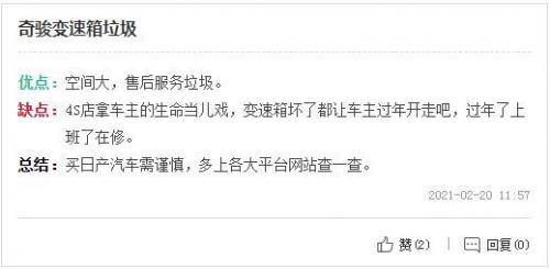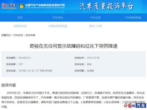 另一方面,经过记者调查,网上存在大量有关奇骏变速箱的故障投诉,车主纷纷表示:“日产奇骏变速箱的故障率太高了!”;“我买来都是严格按照保养手册说的保养。小心翼翼的开,结果还是这样。我们老百姓花几十万买这个车太闹心。强烈要求厂家免费修复延长质保期。”