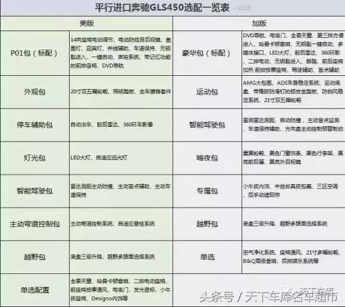 加版奔驰GLS450配置起步就比美规版要高。加版标配豪华包,美规标配是:P01包、19寸轮毂、小窗、真皮座椅带加热、八项电动座椅调节等。具体请看下表-具体罗列了两个版本的选配包及所含配置。