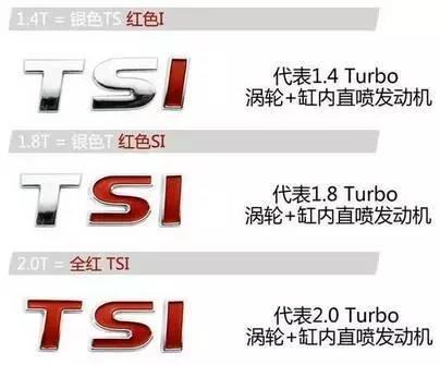 但是,以前的大众可没有标注如此清楚的数值,而是给TSI安排了三种组合来区分排量,银色TS红色I,代表1.4T涡轮缸内直喷发动机,银色T红色SI,代表1.8T涡轮,全红色的TSI则代表2.0T涡轮。
