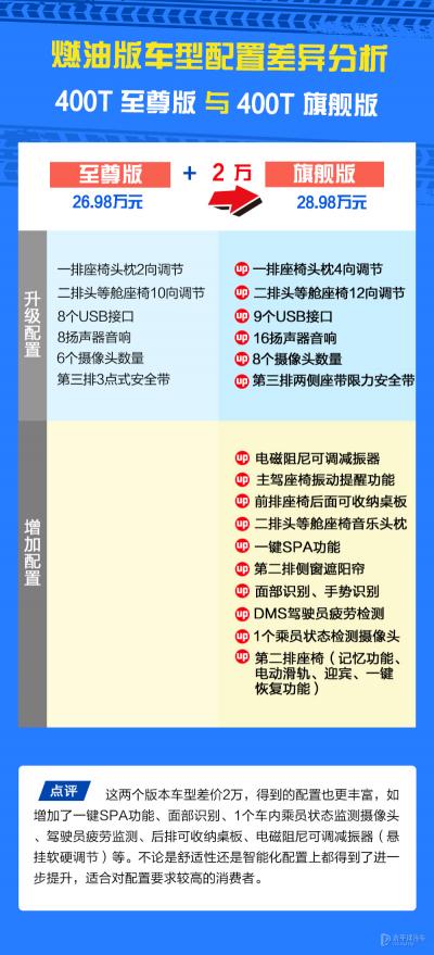 这两个混动版本车型和燃油版的400T至尊版/旗舰版除了动力上的区别外,配置完全一致。双擎旗舰版相比双擎至尊版同样增加了一键SPA功能、面部识别、1个车内乘员状态监测摄像头、驾驶员疲劳监测、后排可收纳桌板、电磁阻尼可调减振器(悬挂软硬调节)等,不论是舒适性还是智能化配置上都得到了进一步提升。参考两个版本2.3万的差价,对舒适性配置没那么极致且家用为主的话,笔者更推荐双擎至尊版。