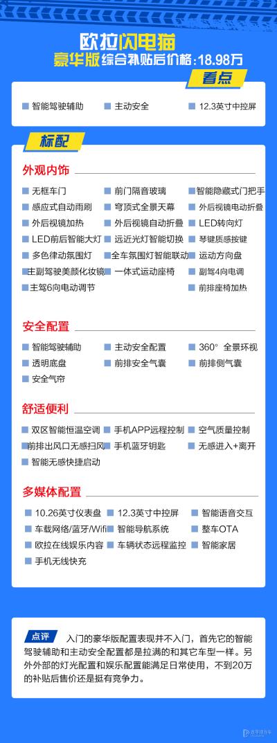 豪华版是闪电猫的入门车型,补贴后的售价不超过19万。但是整体配置表现并不入门,首先它拥有基础的智能驾驶辅助配置、另外车机系统也跟得上。还有灯光和用料配置都和高配车型一致,对于预算不够又想体验这款个性化轿跑电车,入门的豪华版还是值得考虑。