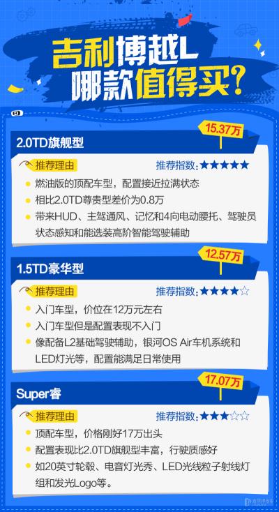 【太平洋汽车导购频道】博越这款车型可以说为吉利创造不少销量成绩,还记得当年全民定价,或者是首台搭载Carplay的国产车,都让它赚足了热度。加上实惠的价格、越级的配置,后期甚至是现在,上市6年来累计销量已超过140万辆的销量表现,也足以说明大家对其的认可。不过当下是个内卷时代,单靠老产品或许不能吸纳到新的客户群,因此有了全新车型博越L(询底价|查参配)的诞生。博越L还是一款紧凑级SUV,定位在博越与星越L之间。虽然都叫博越,不过它与此前的博越Pro、博越X完全不同,是基于吉利CMA架构打造的全新车型,是完全换代的车型,内外的设计也不是一个“物种”。博越L拥有三款动力总成,总共6款车型配置,官方指导价格为12.57-17.07万。接下来将对这几款车型进行配置分析,看看各排量车型推荐情况。
