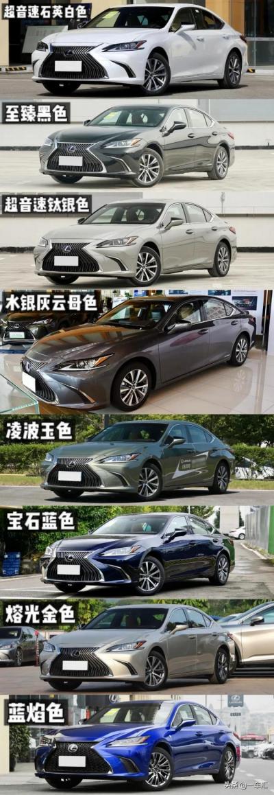 这一代雷克萨斯ES问世后提供了相当丰富的车身配色可选,不过目前在售车型主要就集中在上图中的8种颜色,其中蓝焰色属于F SPORT车型的专属配色。可以看到现款ES车身配色多以一些偏冷的亮色元素为主,能够更好地将车身线条展现出来,目前市面上常见的以银色、金色、黑色这三种居多,至于凌波玉这种小众颜色,或将店内提前预定。