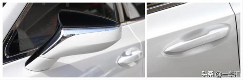 后视镜外壳除了采用双色涂装外,还在中间加入了一段镀铬点缀,看起来相当精致;后视镜集成LED转向灯带,只有顶配300h行政版配备了车侧摄像头。三款卓越版和300h臻享版车型后视镜支持电动调节、加热、折叠,其它版本车型均增加后视镜记忆、倒车自动下翻、自动防炫目等功能。全系车型前排侧窗均采用了多层隔音玻璃,顶配300h行政版车型前后排侧窗均为多层隔音玻璃。全系车型标配了前后排车门无钥匙进入,以及车内无钥匙启动。